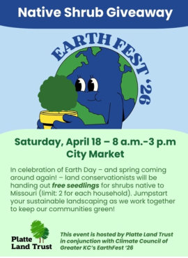 8:00 – 2:00. Visit the PLT booth to get a free Missouri native shrub seedling. Plus activities and information at other Climate Council GKC booths.